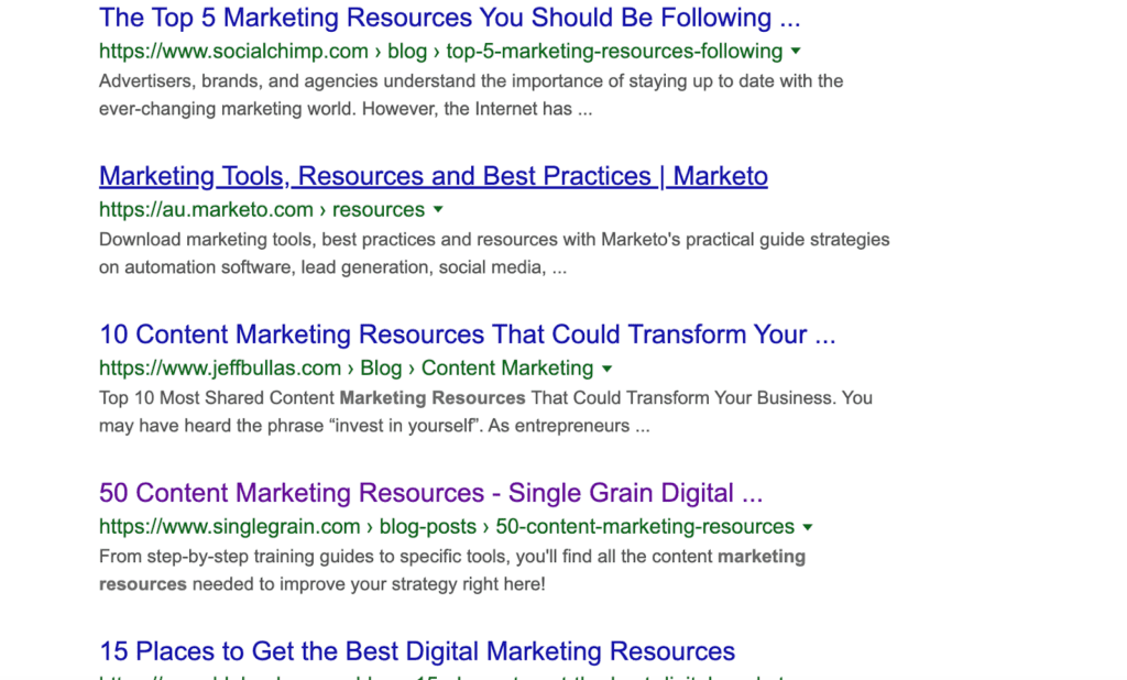 Here’s what finding broken links looks like in action. If we enter “marketing intitle:resources” into Google, we get the following SERP: