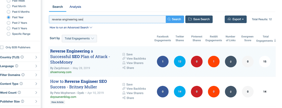 It’s exceptionally easy to use: just type in a relevant search term and voila – you get a page of articles that are highly relevant and broken down by how many social media shares they’ve received.