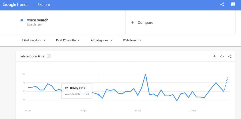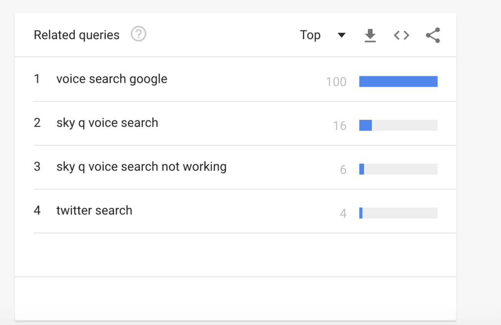 In this instance we used “voice search” and the graph showed a heavy spike in interest in August. Users can also break down their keyword search results by global region and related topics.